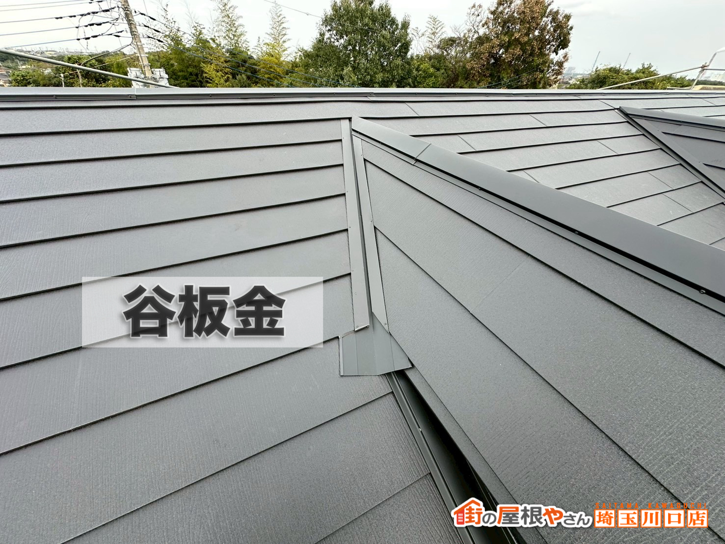 谷部分には「谷板金(たにばんきん)」と呼ばれる金属材を使用し、雨水を効率よく排水する重要な箇所です。